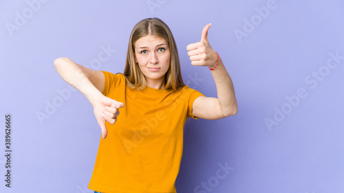Young blonde woman isolated on purple background showing thumbs up and thumbs down, difficult choose concept