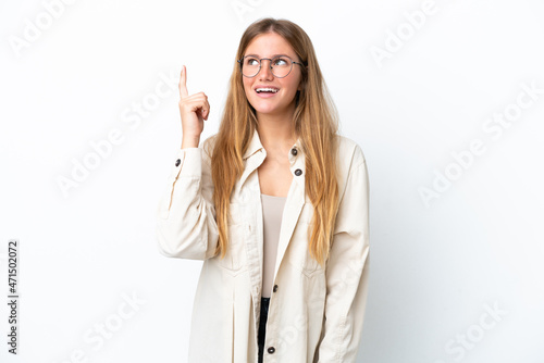 Young blonde woman isolated on white background intending to realizes the solution while lifting a finger up