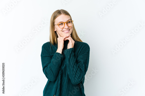 Young blonde woman isolated on white background keeps hands under chin, is looking happily aside.