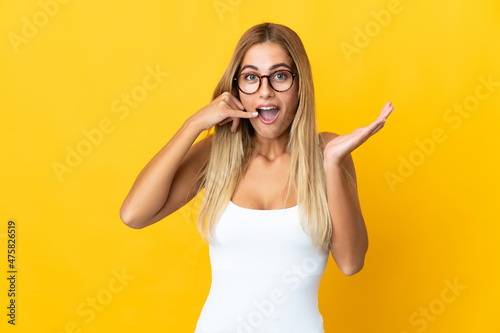 Young blonde woman isolated on yellow background making phone gesture and doubting