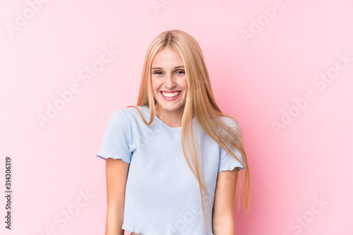 Young blonde woman on pink background laughs and closes eyes, feels relaxed and happy.