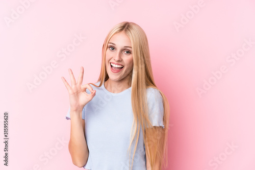 Young blonde woman on pink background winks an eye and holds an okay gesture with hand.