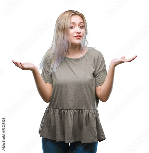 Young blonde woman over isolated background clueless and confused expression with arms and hands raised. Doubt concept.