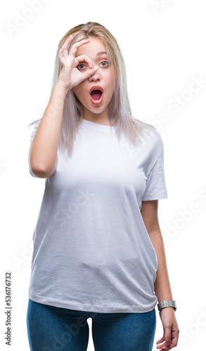 Young blonde woman over isolated background doing ok gesture shocked with surprised face, eye looking through fingers. Unbelieving expression.