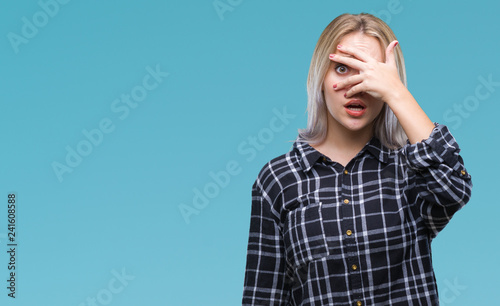 Young blonde woman over isolated background peeking in shock covering face and eyes with hand, looking through fingers with embarrassed expression.