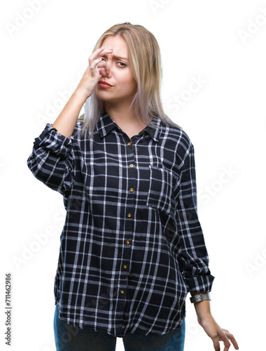 Young blonde woman over isolated background smelling something stinky and disgusting, intolerable smell, holding breath with fingers on nose. Bad smells concept.