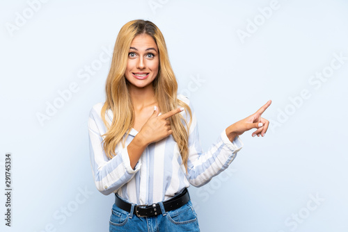 Young blonde woman over isolated blue background frightened and pointing to the side