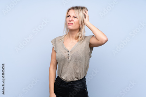 Young blonde woman over isolated blue background having doubts and with confuse face expression
