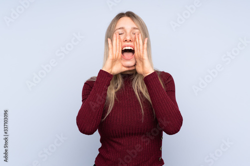 Young blonde woman over isolated blue background shouting and announcing something