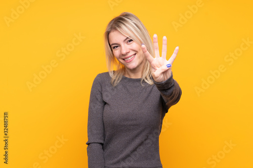 Young blonde woman over isolated yellow background happy and counting four with fingers