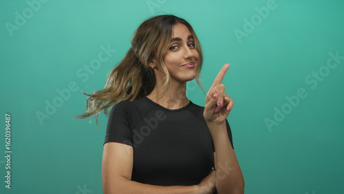 Young blonde woman points finger upward in a green photo studio; confidence playfulness motivation empowerment.