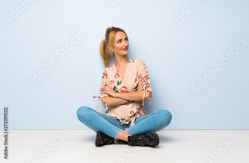 Young blonde woman sitting on the floor happy and smiling