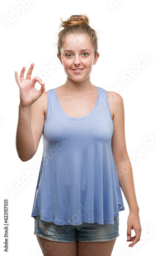 Young blonde woman smiling positive doing ok sign with hand and fingers. Successful expression.
