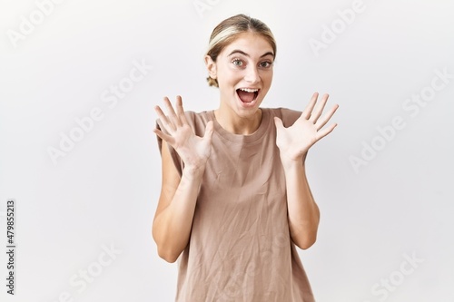 Young blonde woman standing over isolated background celebrating crazy and amazed for success with arms raised and open eyes screaming excited. winner concept