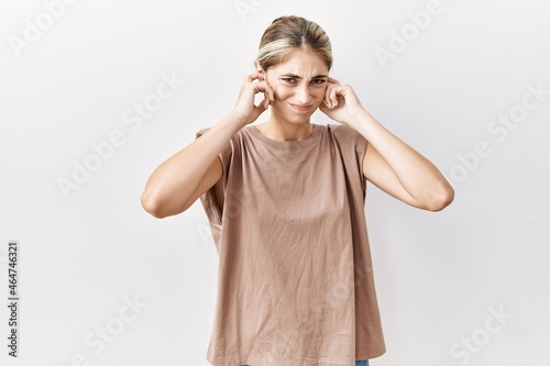 Young blonde woman standing over isolated background covering ears with fingers with annoyed expression for the noise of loud music. deaf concept.