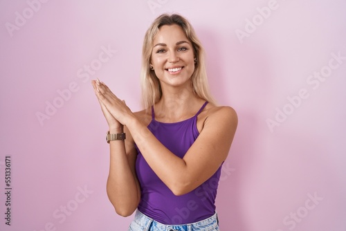 Young blonde woman standing over pink background clapping and applauding happy and joyful, smiling proud hands together