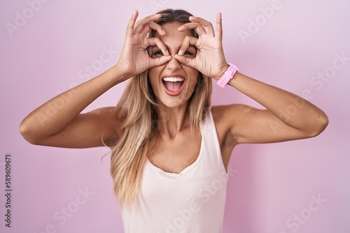 Young blonde woman standing over pink background doing ok gesture like binoculars sticking tongue out, eyes looking through fingers. crazy expression.