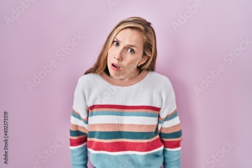 Young blonde woman standing over pink background in shock face, looking skeptical and sarcastic, surprised with open mouth