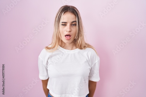 Young blonde woman standing over pink background in shock face, looking skeptical and sarcastic, surprised with open mouth