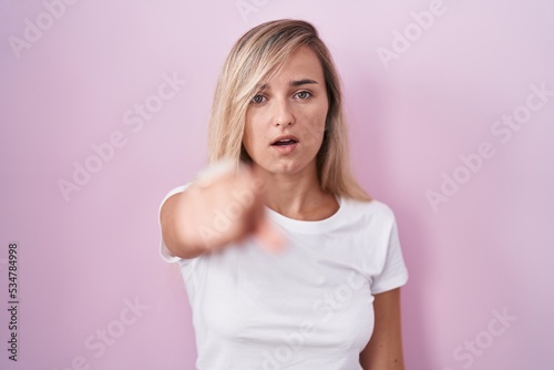 Young blonde woman standing over pink background pointing displeased and frustrated to the camera, angry and furious with you