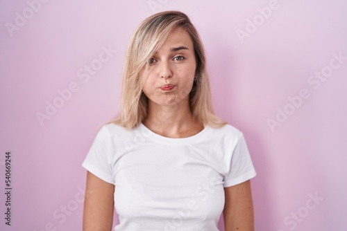Young blonde woman standing over pink background puffing cheeks with funny face. mouth inflated with air, crazy expression.
