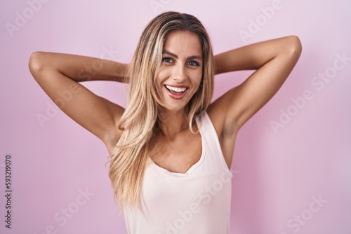 Young blonde woman standing over pink background relaxing and stretching, arms and hands behind head and neck smiling happy