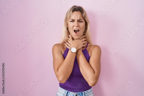Young blonde woman standing over pink background shouting suffocate because painful strangle. health problem. asphyxiate and suicide concept.