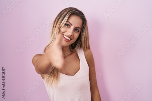 Young blonde woman standing over pink background smiling friendly offering handshake as greeting and welcoming. successful business.