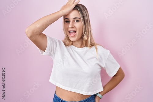 Young blonde woman standing over pink background surprised with hand on head for mistake, remember error. forgot, bad memory concept.