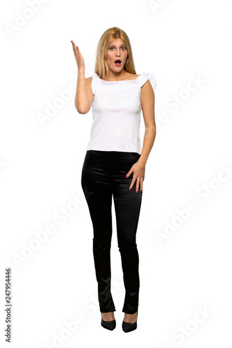 Young blonde woman surprised and shocked while looking right over isolated white background