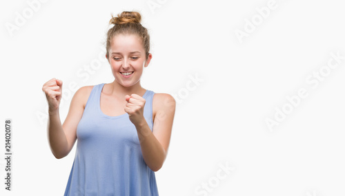 Young blonde woman very happy and excited doing winner gesture with arms raised, smiling and screaming for success. Celebration concept.