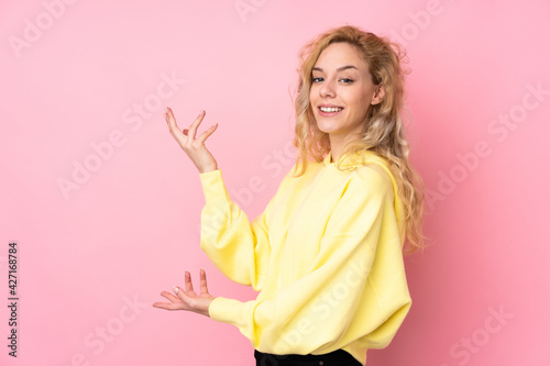 Young blonde woman wearing a sweatshirt isolated on pink background extending hands to the side for inviting to come