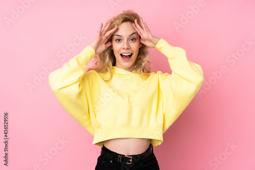 Young blonde woman wearing a sweatshirt isolated on pink background with surprise expression