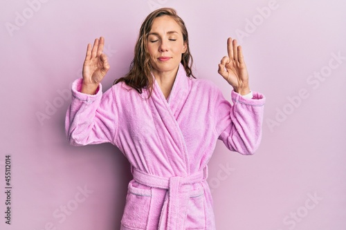 Young blonde woman wearing bathrobe relax and smiling with eyes closed doing meditation gesture with fingers. yoga concept.