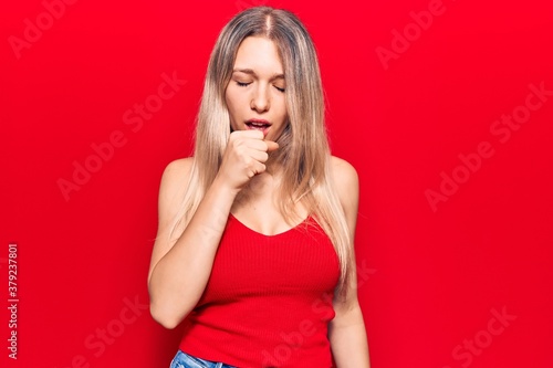 Young blonde woman wearing casual clothes feeling unwell and coughing as symptom for cold or bronchitis. health care concept.