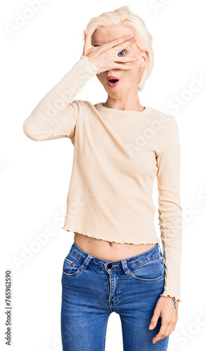 Young blonde woman wearing casual clothes peeking in shock covering face and eyes with hand, looking through fingers with embarrassed expression.