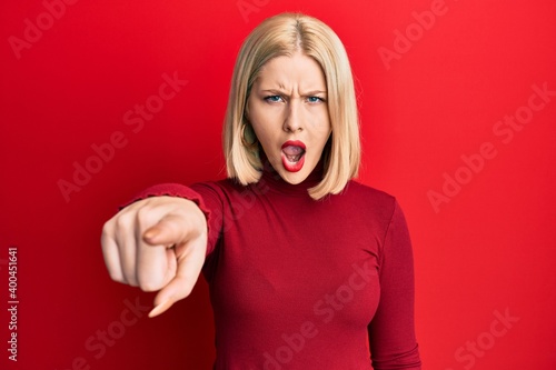 Young blonde woman wearing casual clothes pointing displeased and frustrated to the camera, angry and furious with you
