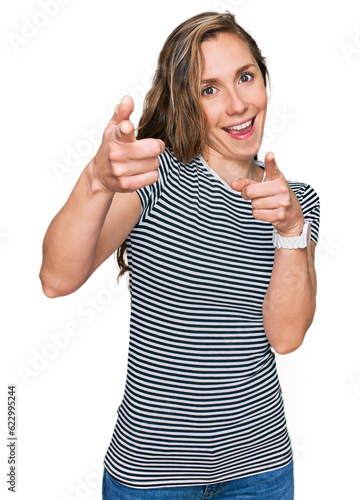 Young blonde woman wearing casual clothes pointing fingers to camera with happy and funny face. good energy and vibes.