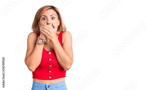 Young blonde woman wearing casual clothes shocked covering mouth with hands for mistake. secret concept.