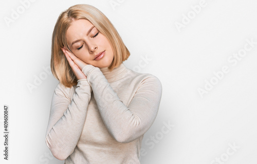 Young blonde woman wearing casual clothes sleeping tired dreaming and posing with hands together while smiling with closed eyes.