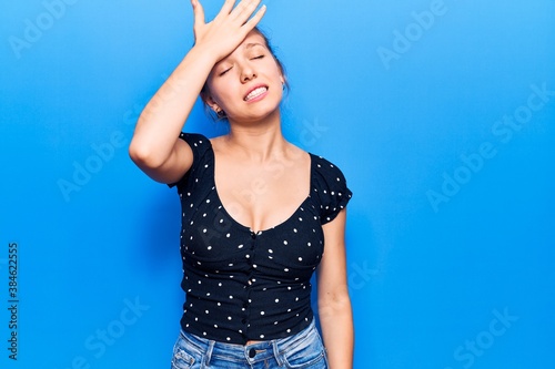 Young blonde woman wearing casual clothes surprised with hand on head for mistake, remember error. forgot, bad memory concept.