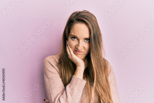 Young blonde woman wearing casual sweater thinking looking tired and bored with depression problems with crossed arms.
