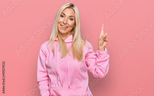 Young blonde woman wearing casual sweatshirt pointing finger up with successful idea. exited and happy. number one.