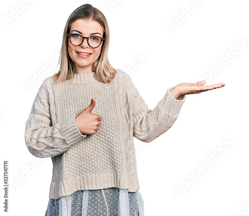 Young blonde woman wearing glasses showing palm hand and doing ok gesture with thumbs up, smiling happy and cheerful