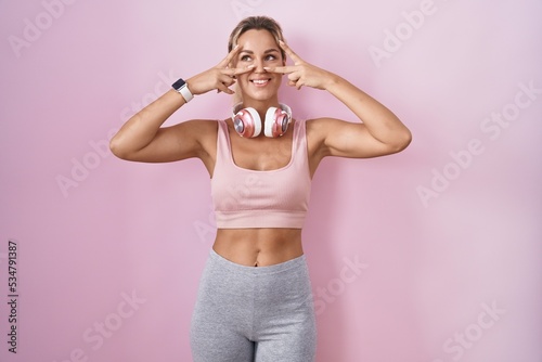 Young blonde woman wearing sportswear and headphones doing peace symbol with fingers over face, smiling cheerful showing victory