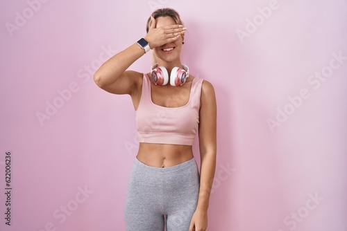 Young blonde woman wearing sportswear and headphones smiling and laughing with hand on face covering eyes for surprise. blind concept.