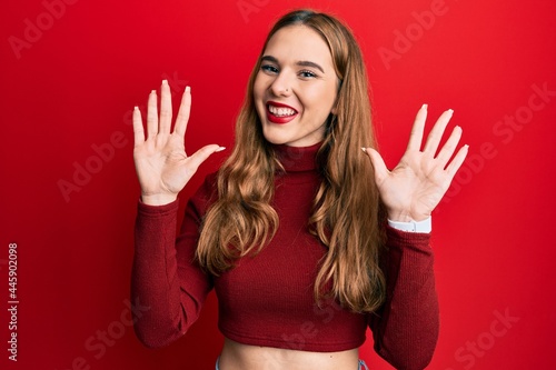 Young blonde woman wearing turtleneck sweater showing and pointing up with fingers number ten while smiling confident and happy.