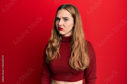 Young blonde woman wearing turtleneck sweater skeptic and nervous, frowning upset because of problem. negative person.