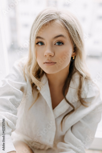 Young blonde woman, wearing white cotton shirt, indoors, in soft window light, looking at camera.
