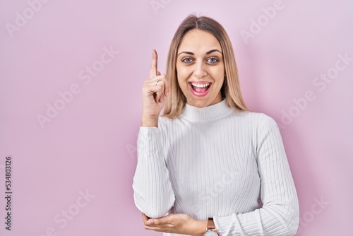 Young blonde woman wearing white sweater over pink background pointing finger up with successful idea. exited and happy. number one.